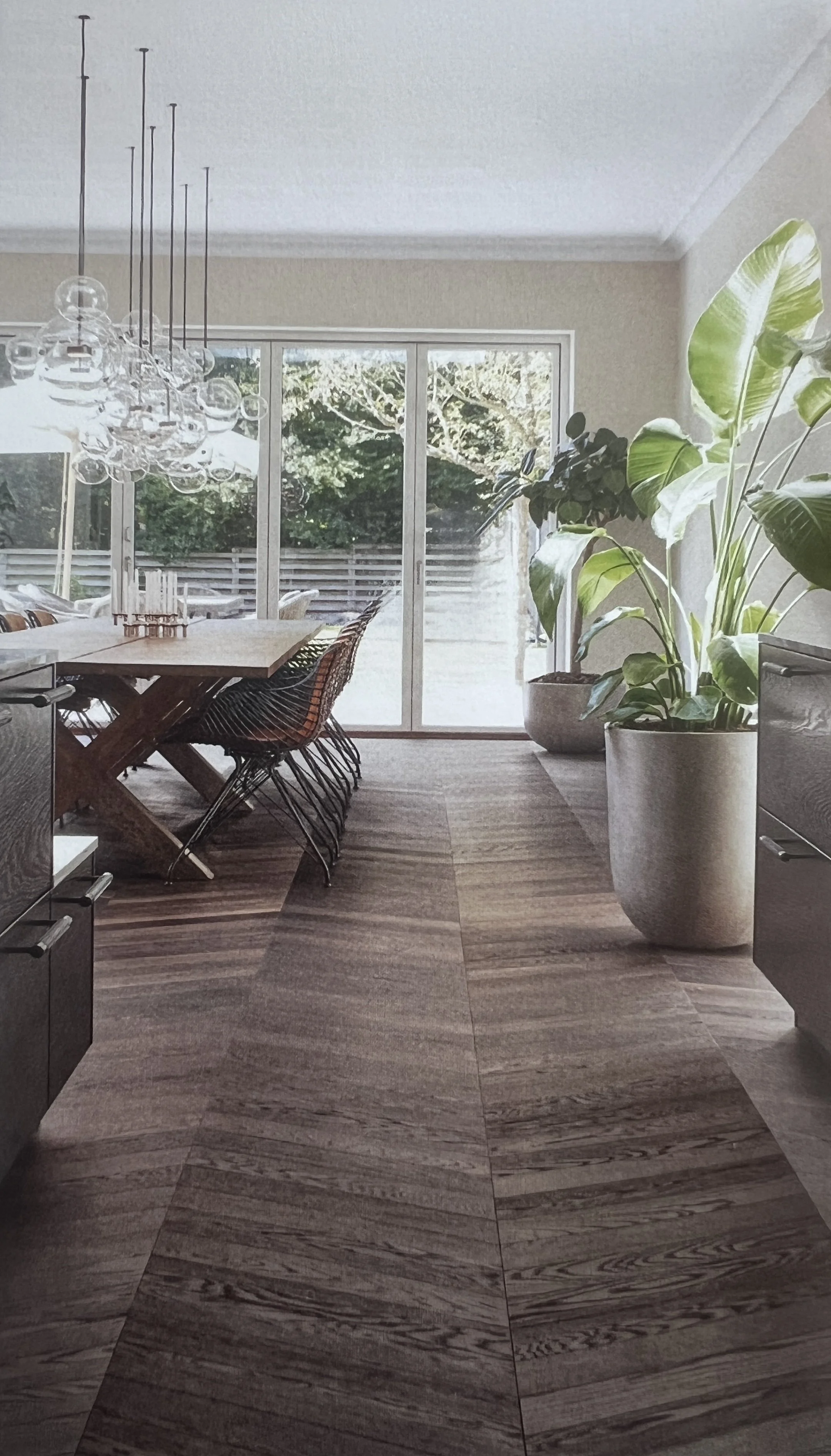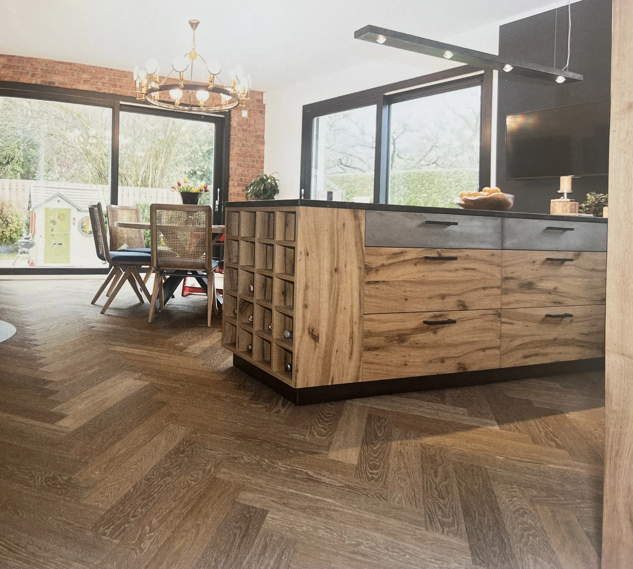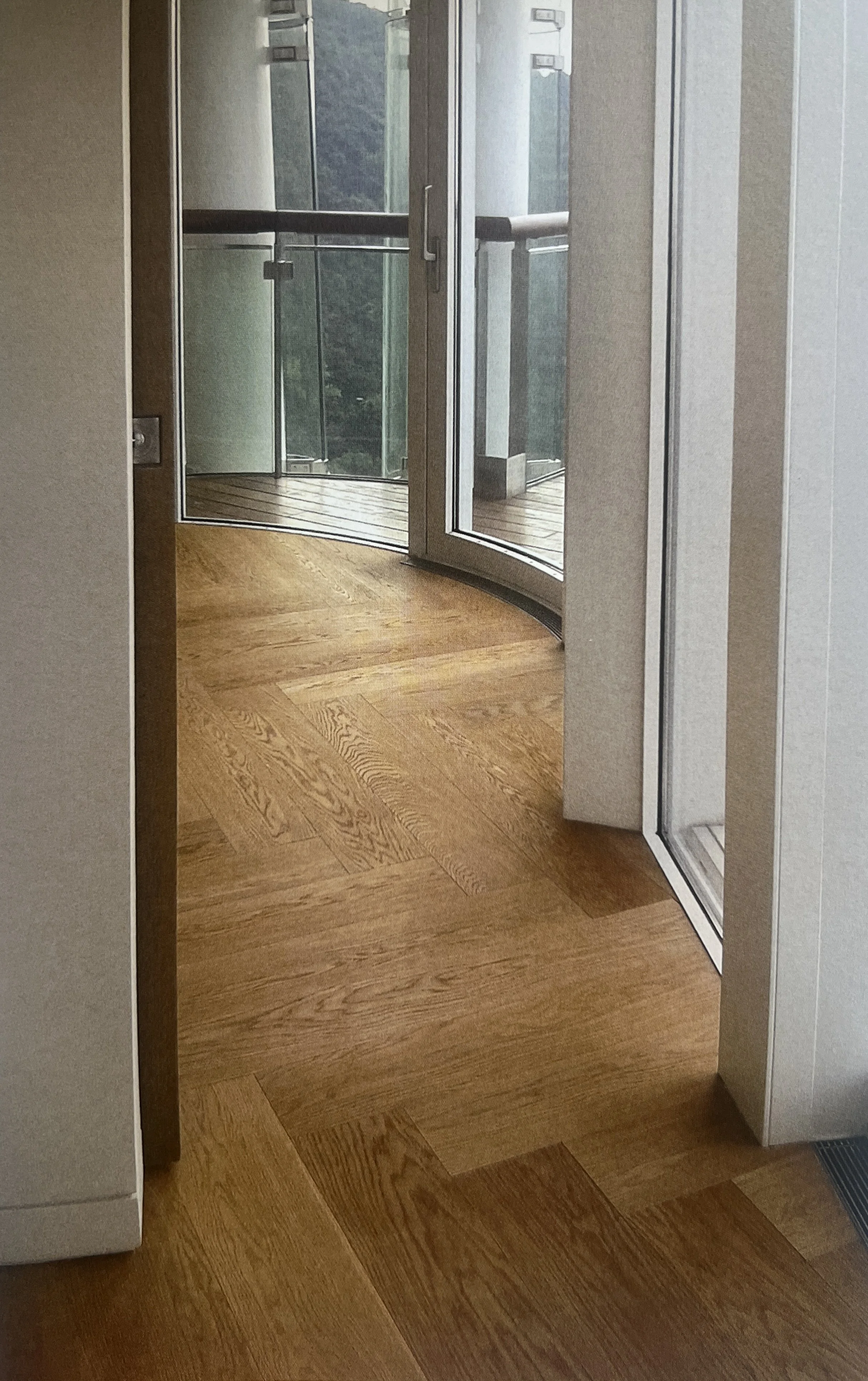 Chevron flooring features planks cut at 45° or 60° angles, forming a continuous V-shaped zigzag pattern for a sleek, modern look. This design creates a sense of flow, making spaces feel elongated and luxurious.
